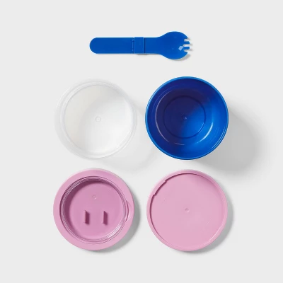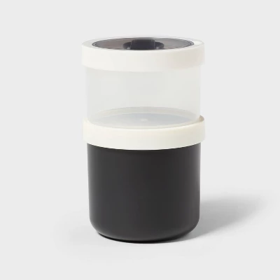 Enhance the functionality of your kitchen with this 5-Piece Overnight Oats Food Storage Container Set from Room Essentials™. This set contains one small container in a clear hue, one large container, and two lids, one featuring a clasp to hold the foldable spoon. Plus, this 27-fluid-ounce food container set is perfectly sized to store and pack adequate portions.