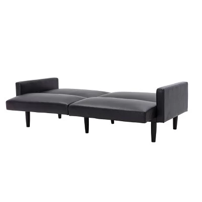 Make moments shared with friends and family more precious with this Black Faux-Leather Futon Sofa with Arms from Room Essentials™. Upholstered in a black faux-leather fabric, this sleek contemporary sofa has arms for comfortable support and easily converts into a bed with its click-clack technology so you can accommodate overnight guests. With this stylish and functional futon sofa, you’ll love sitting, relaxing and chatting for longer in your updated living space.