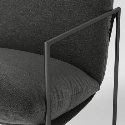 Bring a modern lounge-worthy, hammock-like seating experience to your home with this Metal Framed Sling Accent Chair from Room Essentials™. This armed chair features a black powder-coated metal frame with distinct geometrical, square looped legs on sides that extend upward to form armrests. Plus, it has a suspended fabric seat upholstered in dark gray with comfy padding for luxurious comfort. Place it in your study, living room or near a window with an outdoor view to enjoy.
